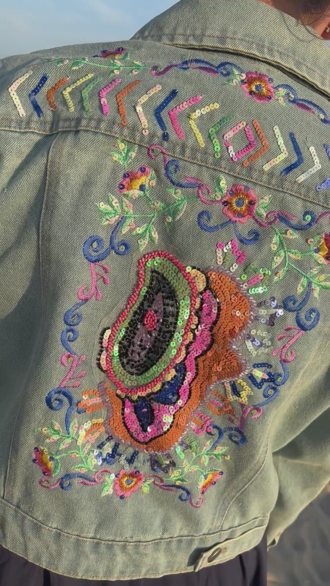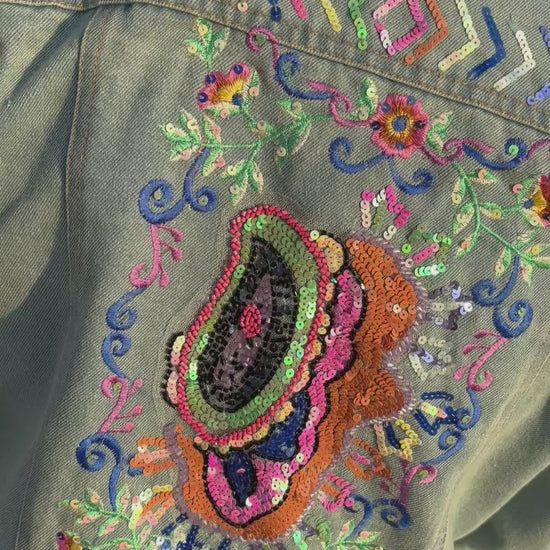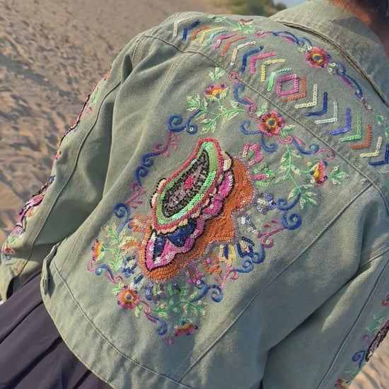 "Get ready to rock the festival scene in style with our Paisley Embroidered Denim Jacket! This boho-inspired jacket features intricate paisley embroidery on classic denim for a perfect mix of edgy and chic. Perfect for Glastonbury and summer days, this jacket is a must-have for every stylish music lover. Don't miss out!"
